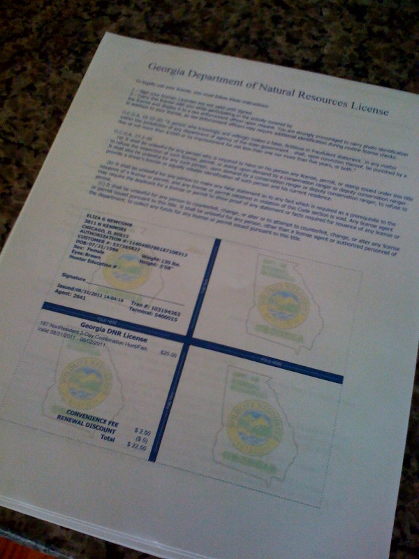 Do you know the fines for fishing without a fishing license by the DNR (Dept. of Natural Resources)? Freaking severe! But, with this handy sheet of paper I can fish and hunt for three days in Georgia. Don’t worry, I don’t hunt π and I almost never actually catch fish. But the license is for the act of trying to catch fish, not actually catching them. The licenses can be purchased quickly and easily off the state’s DNR site for about $20 for non-residents. My dad said his was wayyy less for a two year, like $16! It is silly not to buy one. Seriously, if you don’t buy one, you will get checked by a park ranger and fined, no fun! Those dudes are serious and smiling a lot won’t get you anywhere with them. And that was your friendly lesson in the legalities of fishing from yours truly.