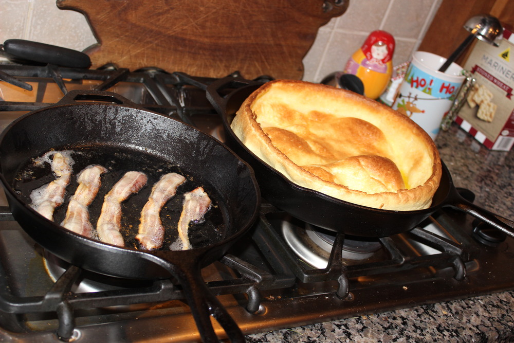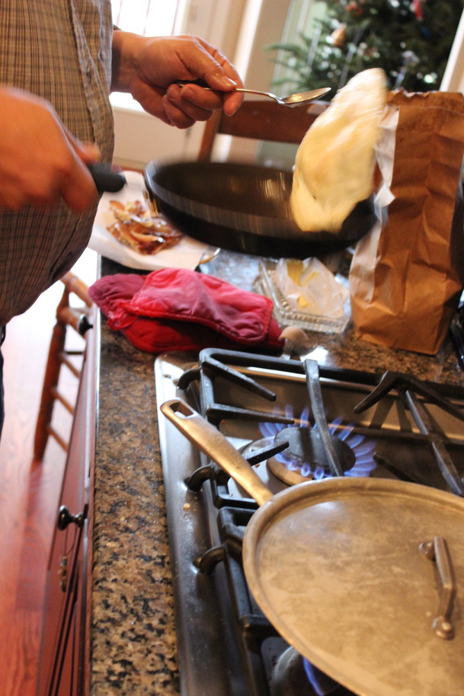 Cooking with my dad is always a favorite – and this Christmas Day was no different. We made German Pancakes (thanks, Robin, for an amazing recipe that was a huge crowd pleaser) and thick cut bacon from the butcher on my dad’s new cast iron cookware, a gift from yours truly. And check out those egg-making skills from earlier in the week at home! The man has multiple pans to make eggs in whatever style desired. Over-medium for me, sunny-side up for him and basted for my grandma. Whatta champ.