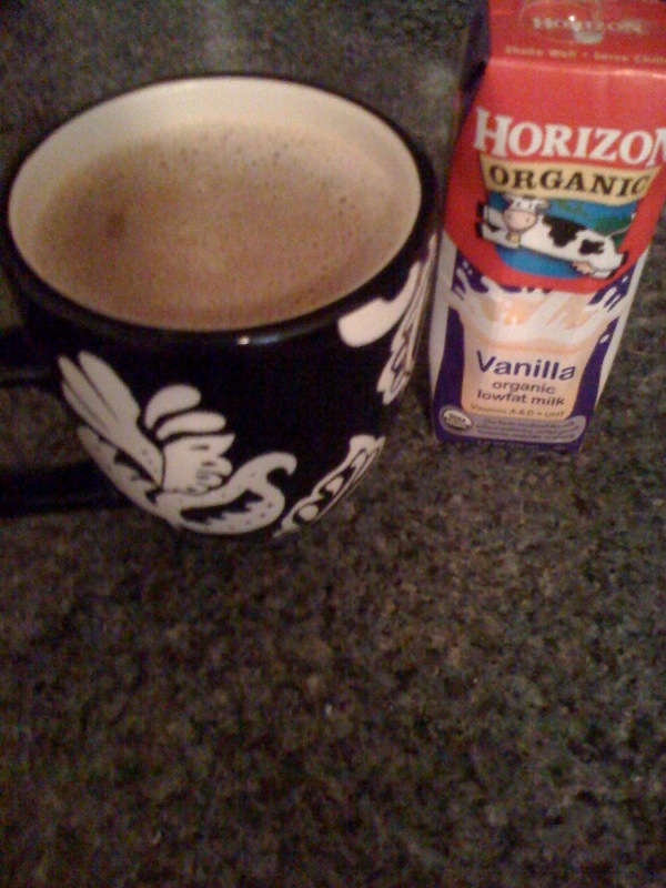 Horizon Organic box-milks in vanilla + french vanilla coffee = frothy latte on a budget. Here’s the secret – only punch a tiny hole with the straw to ensure frothiness. I’ve gone through a couple boxes scientifically testing prime frothiness. Sunday morning and I get it right, life is good.