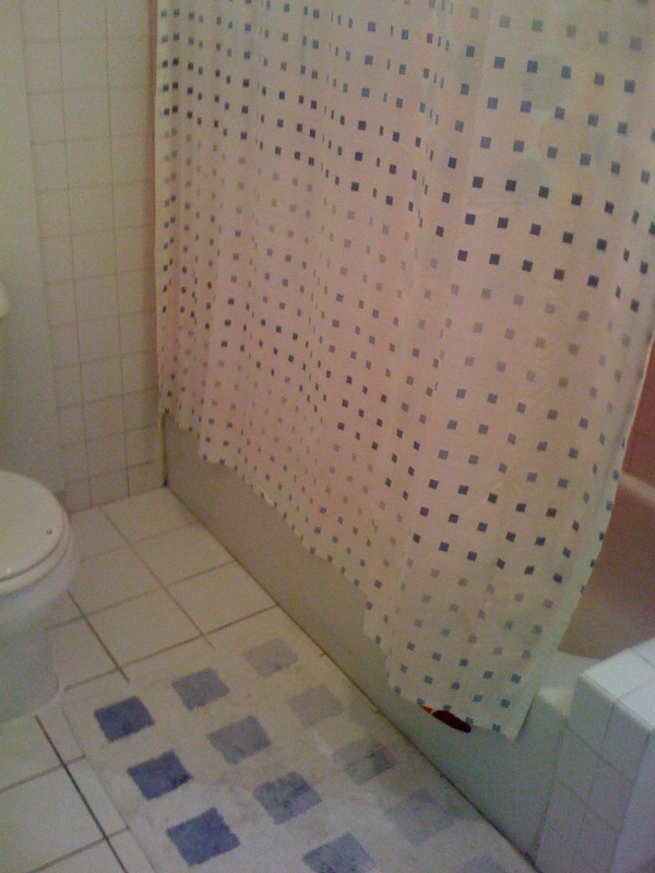 Oh bathrooms – how I love to dream about what you could look like! But with only a day and a strict budget, I had to improvise. My mom had been holding on to some bathroom stuff for me, and she was my lifesaver! Essentially, she sent me a bathroom-in-a-box for lack of a better term. She’s a total champ. So, here is where the bathroom stands: