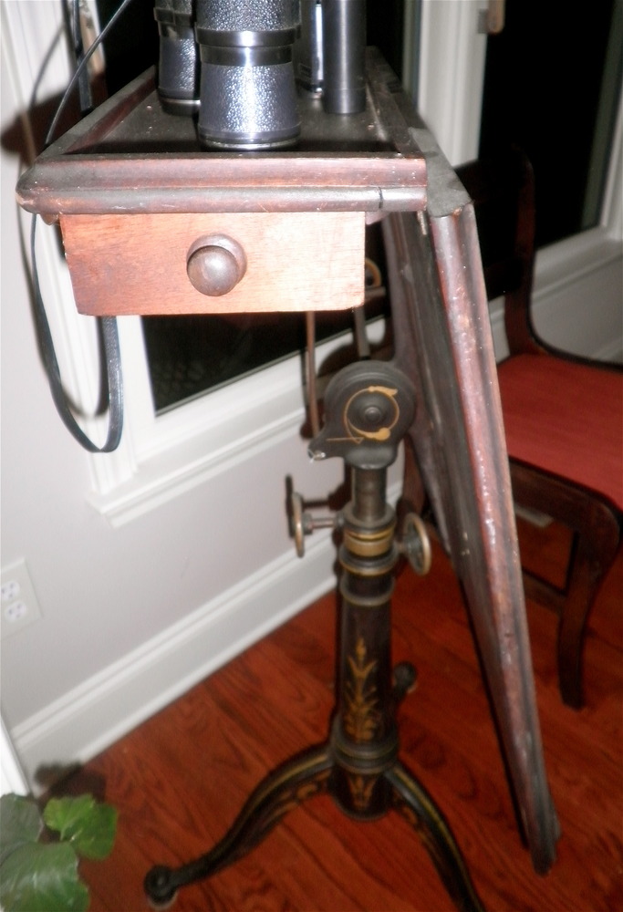 First off – this drafting table. It was created in Worcester, Mass. before the turn of the century and all of the mechanics of the table still work. It currently lives in my parents informal dining area behind the kitchen table. It’s purpose? To hold binoculars, look good and start interesting conversations.