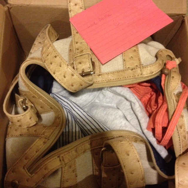 • Canvas purse with faux ostrich leather, perfect for carrying a book, some sunscreen, a water bottle…or wine…to a park. Already used it to go out this week! In Denver, it gets crazy cool at night, so I always need a sweater. Big purses are put to good use here!