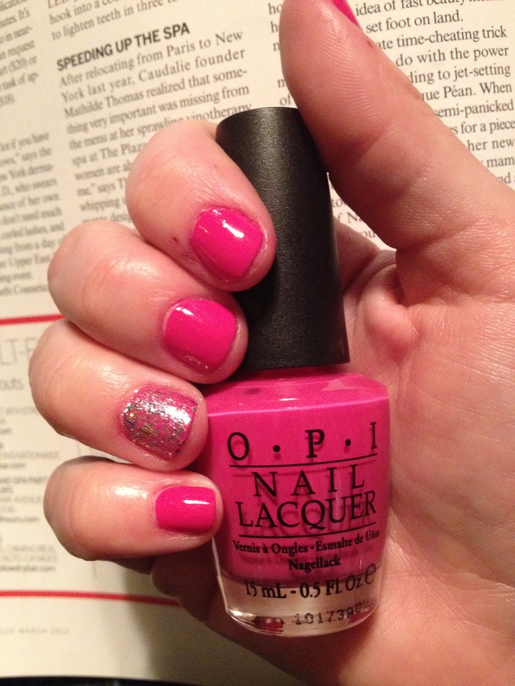 One day before Valentine’s Day! A little pink, purple and gold plaid on the nails and a big smile on my face. I’m making cookies for Leo for Valentine’s Day, reading magazines and relaxing. That leads me to two of the things that I love a ton – nail polish and printed material (books, magazines, heck, I even love maps). I stopped in to my local nail polish supplier and picked up a few new colors for late winter and into the start of spring, but the main goal was a fun magenta base for v-day nails. You’ll note these pretty bottles sitting a top a very pretty Harry Potter book. See how I’m combining two loves into one Manic(ure) Monday?